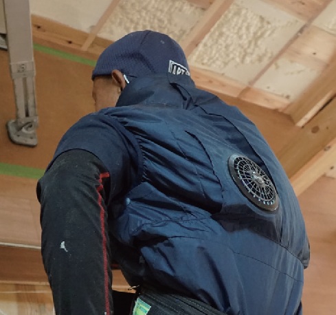 「この製品は、腰にファンがついているタイプと比較して、かがんでもファンが作業の邪魔にならず、裾ゴムがしっかりしているためずり上がることなく、ストレスフリーで快適に作業ができます。