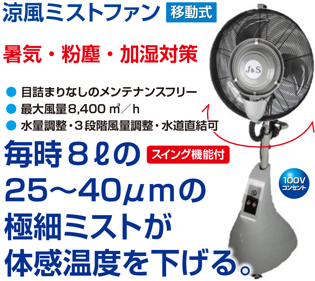 暑気対策・粉塵対策・加湿対策ができ、毎時8リットルの25〜40μmの極細ミストが体感温度を下げます。