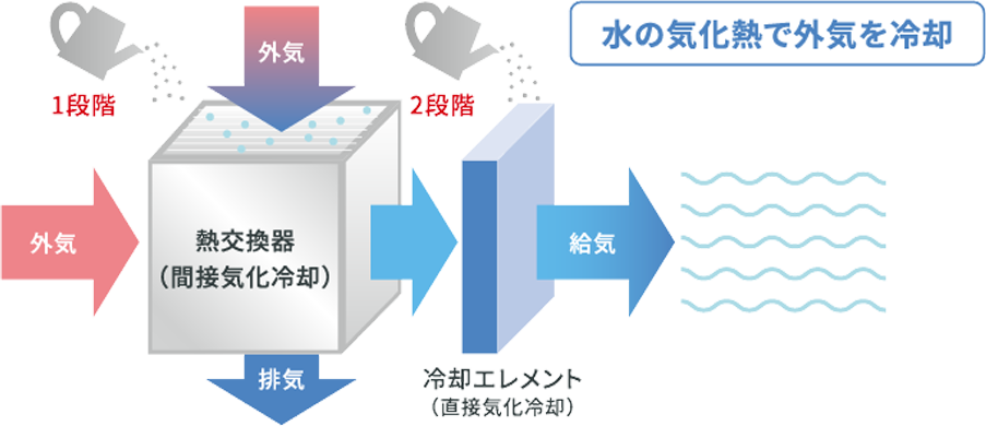 取り込んだ外気を、水の気化熱を利用して2段階で冷却。