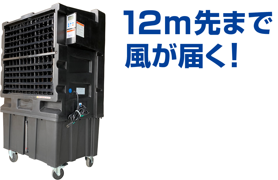 冷やした空気を12m先まで送り出すパワフル設計です。工事不要でキャスター付きなので、設置後も使いたい場所に移動できます。