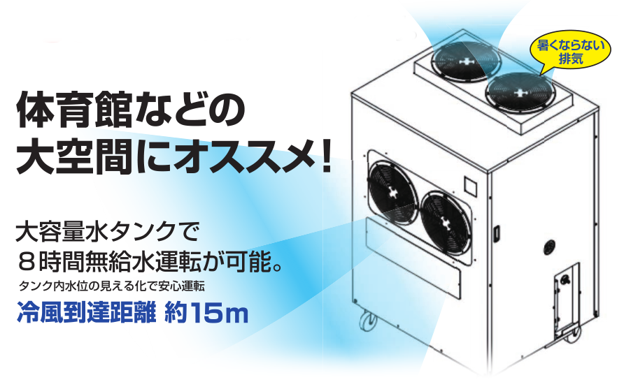 100Vコンセントにさすだけで強冷風!モード切り替えで風量の調整も可能。排気が熱くなりにくく、快適空間を作ります。