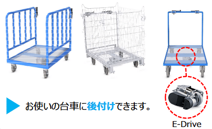 電動アシストユニットは既存の台車に後付けするだけで、最大1,000kgまでの重量物でも、ハンドル操作一つで簡単に搬送できる製品です。